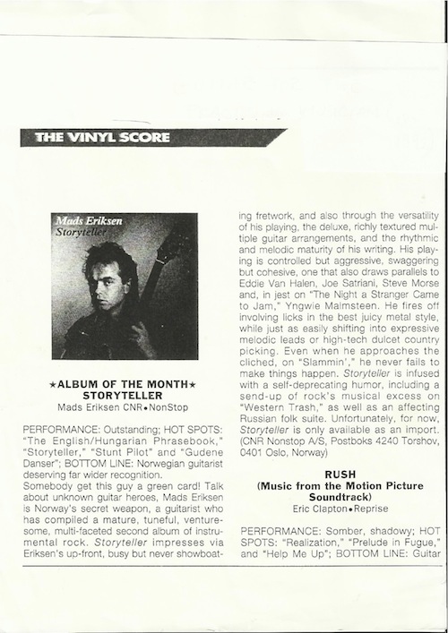 OCT 2021: 30 YEARS AGO!IT WAS 30 YEARS AGO TODAY!!On October 19 1991 Mads Released his second solo album Storyteller. It is his most critically acclaimed and commercially successful album to date and became his first international release. It was distributed all over Europe through the German record company MGI. Storyteller was selected as Album Of The Month in the June 1992 edition of Guitar For The Practicing Musician, then the biggest guitar magazine in America. As we can see, a certain Eric Clapton took a highly respectable second place. Here is Mads performing Storyteller a few years ago: Video